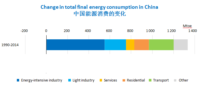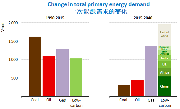 對(duì)比過去25年和未來25年的差異,Tim Gould表示,從1990年到2015年,能源需求增加了60%,煤炭無疑是最大的贏家;而未來25年,天然氣可能將成為最大的贏家。他認(rèn)為,從過去25年和未來25年的對(duì)比,可以看到,中國從1990年到2014年能源需求增長(zhǎng)主要來源于高耗能行業(yè),比如水泥、鋼鐵;而未來25年,雖然部分高耗能行業(yè)如化工產(chǎn)業(yè)還是會(huì)有一些增長(zhǎng),但鋼鐵等行業(yè)會(huì)大幅下降,高耗能行業(yè)不再是未來中國經(jīng)濟(jì)增長(zhǎng)的主要?jiǎng)恿?,由此帶來的煤炭消費(fèi)減少將為電力和天然氣的增長(zhǎng)提供空間。