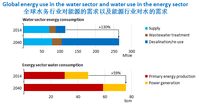 同時(shí),水務(wù)行業(yè)也越來越多的需要能源。2014年,全球用電量4%用于提取,分配和處理廢水,并且使用5000萬噸柴油用于海水淡化廠。到2040年,水務(wù)部門使用的能源量預(yù)計(jì)還將增加一倍以上。在中東和北非,海水淡化能力急劇上升,對(duì)廢水處理(和更高水平的處理)的需求也在增長(zhǎng),特別是在新興經(jīng)濟(jì)體。到2040年,中東16%的用電與供水有關(guān)。管理好能源和水的聯(lián)系對(duì)成功實(shí)現(xiàn)發(fā)展的范圍和氣候目標(biāo)十分重要。