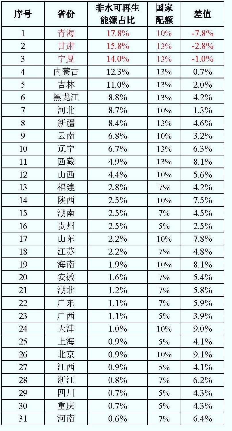 那目前各省的非水可再生能源占發(fā)電量的多少呢?