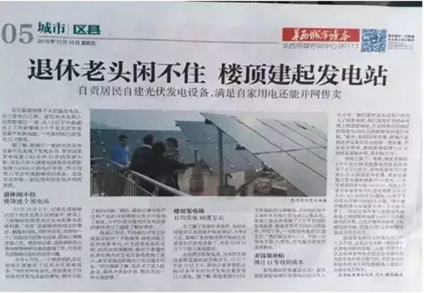 2015年10月16日,《華西都市報(bào)》報(bào)道了四川自貢退休老人在樓頂自建光伏電站,獲取售電補(bǔ)貼,并借以養(yǎng)老的故事。