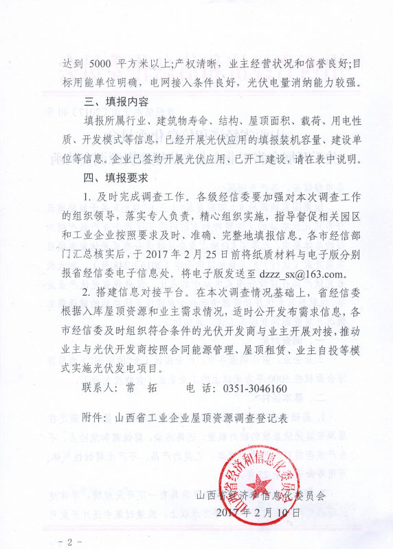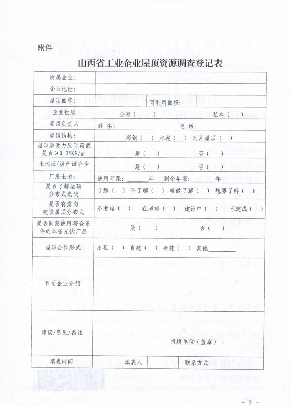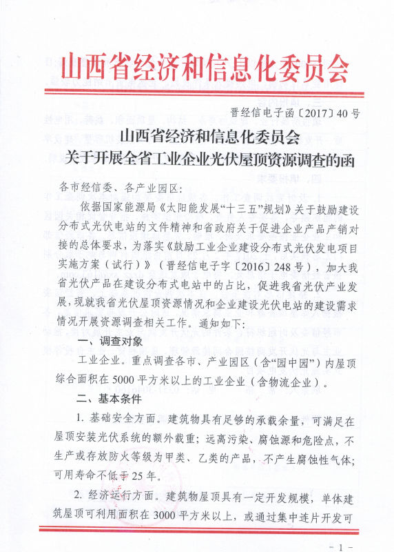 近日,山西省經(jīng)信委下發(fā)《關(guān)于開展全省工業(yè)企業(yè)光伏屋頂資源調(diào)查的函》,要求全省各市經(jīng)信委、各產(chǎn)業(yè)園區(qū)對轄區(qū)內(nèi)屋頂綜合面積在5000平方米以上的工業(yè)企業(yè)進(jìn)行調(diào)查,并于2月25日之前將紙質(zhì)材料和電子版上報。
