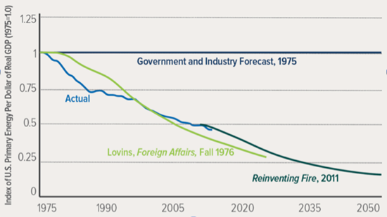 圖2:能源強度預(yù)測值對比:1975年前后官方預(yù)測值、盧安武在1976年預(yù)測值、實際值、以及2011年落基山研究所重塑能源項目的預(yù)測值(在更低成本下可實現(xiàn)進一步三倍下降)。而在目前所取得的能源強度下降中,大約1/3來自于經(jīng)濟結(jié)構(gòu)轉(zhuǎn)型,2/3來自于更優(yōu)化的技術(shù)效率。