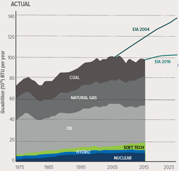 •圖3B:實際發(fā)展狀況,以及能源信息署在2004年和2016年發(fā)布的參考情形預(yù)測,為與現(xiàn)實保持一致,后者與前者相比下降明顯。2015年實際一次能源消耗量(97.5 QBTU)比圖1B高約18.5QBTU,其中的15.4QBTU反映了從2000-2015年實際能源強度下降的1/3(如圖2所示)。圖3A所示的軟技術(shù)還排除了電力系統(tǒng)損耗。圖1B未考慮而圖3B包括了原料用量(2011年為4.5QBTU),因此沒有對對比進行調(diào)整。