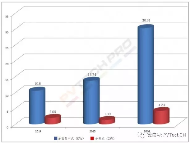 圖一:2014-2016我國(guó)新增地面集中式電站與分布式裝機(jī),數(shù)據(jù)來源:國(guó)家能源局