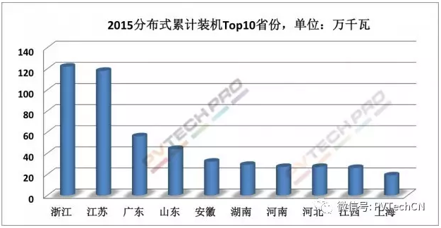 圖二: 2015年分布式光伏累計(jì)裝機(jī)Top10省份,單位:萬(wàn)千瓦