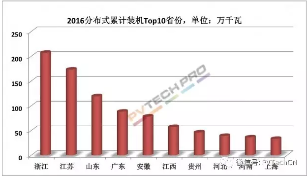 市場(chǎng)區(qū)域方面同時(shí)出現(xiàn)變化,逐漸由西北部向中東部等地區(qū)轉(zhuǎn)移,根據(jù)CPIA數(shù)據(jù),2016年西北地區(qū)電站裝機(jī)9.74GW,而西北以外地區(qū)達(dá)到24.8GW,占全國(guó)總量的72%。其中,中東部地區(qū)分布式光伏增長(zhǎng)明顯,累計(jì)裝機(jī)排名前十位的省份這兩年被浙江、山東、江蘇、廣東、安徽等占據(jù),分布式規(guī)模較大(如圖二、圖三)。