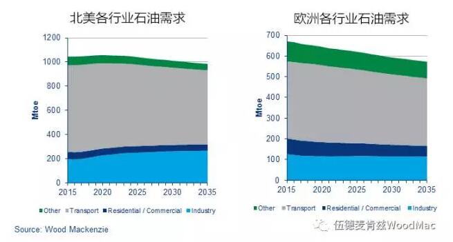 與世界上其它地區(qū)相比,北美和歐洲的石油需求更可能出現(xiàn)負(fù)增長。這一方面因?yàn)樗麄冮L期在碳減排方面做出的努力,另一方面也得益于北美和歐洲較為充足和低成本的天然氣供應(yīng)。我們預(yù)計(jì)到2035年,全球的能源需求將趨于平穩(wěn),北美的增長變得更加溫和,而歐洲的需求將逐步下降。本文基于我們的石化燃料系列報(bào)告,將進(jìn)一步分析未來20年能源需求的發(fā)展趨勢和可再生能源的崛起。