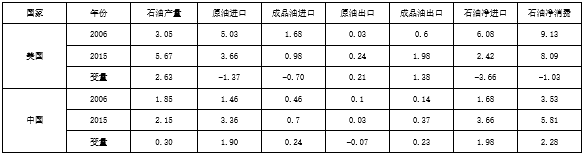 通過頁巖氣開發(fā)技術進步還大幅度增加了頁巖油的產量,并通過天然氣對燃油的替代減少了石油的消費量。2015年美國原油年產量5.67億噸,同比增加了8.5%,比2008年美國原油產量最低點的3.023億噸增加2.649億噸,產量增加了87.6%。