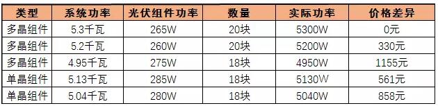 以5.3kW系統(tǒng)為例,其他功率的系統(tǒng)產(chǎn)生的價(jià)格差異見下表: