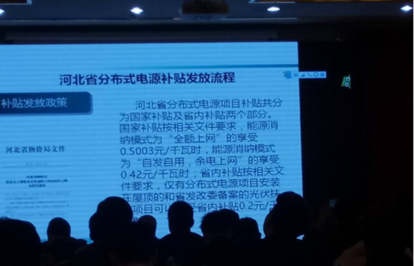 在會(huì)議期間,中國(guó)光伏行業(yè)協(xié)會(huì)江華主任就《分布式光伏發(fā)展前景與展望》為題進(jìn)行演講。并表示,河北省分布式電源項(xiàng)目補(bǔ)貼分為國(guó)家及省內(nèi)補(bǔ)貼兩個(gè)部分,國(guó)家補(bǔ)貼按照相關(guān)文件要求,能源消納模式為“全額上網(wǎng)”的享受0.5003元/千瓦時(shí),能源消納模式為“自發(fā)自用,余電上網(wǎng)”的享受0.42元/千瓦時(shí);省內(nèi)補(bǔ)貼按相關(guān)文件要求,僅有分布式電源項(xiàng)目安裝在屋頂?shù)暮褪“l(fā)改委備案的光伏扶貧項(xiàng)目可以接受省內(nèi)補(bǔ)貼0.2元千瓦??傮w而言,河北大部分光照條件充足,政府補(bǔ)貼也相對(duì)比較高。