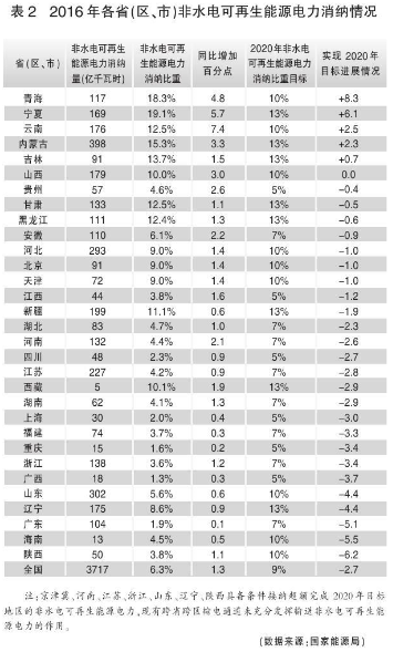 從非水電可再生能源消納比重增長來看,云南、寧夏、青海三省同比增長較快,分別上升了7.4、5.7和4.8個百分點。從完成2020年非水電可再生能源電力消納比重目標情況來看,青海、寧夏、云南、內(nèi)蒙古、吉林和山西非水電可再生能源消納比重已達到2020年目標,貴州、甘肅、黑龍江、安徽、京津冀和江西接近實現(xiàn)目標,陜西、海南、廣東、遼寧和山東實現(xiàn)2020年目標還有較大差距。(詳見表2)