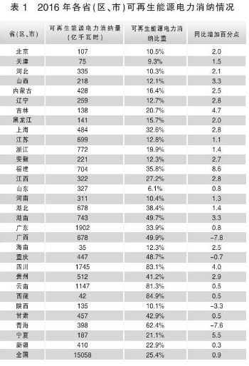 2016年,包含水電在內(nèi),全部可再生能源電力消納量穩(wěn)步提高,達到15058億千瓦時,占全社會用電量的比重為25.4%,同比上升0.9個百分點。其中,西藏、四川、云南可再生能源電力消納占本地區(qū)全社會用電量分別為84.9%、83.1%、81.3%,位列前三甲。其他比重較大的省(市、區(qū))包括青海(占比62.4%)、廣西(占比49.9)、湖南(占比49.7%)、重慶(占比48.7%)、甘肅(占比42.9%)、貴州(占比41.2%)、湖北(占比38.4%)。(詳見表1)