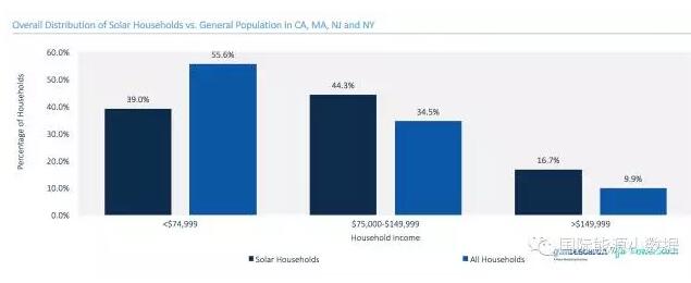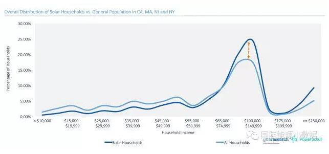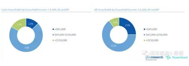那么,屋頂光伏是不是真的只是富人“玩具”?GTM Research和PowerScout公司針對這一問題對美國加利福尼亞、馬薩諸塞、新澤西、紐約四個州的50多萬戶屋頂光伏用戶(“光伏家庭”)進行統(tǒng)計分析,得出以下結(jié)論: