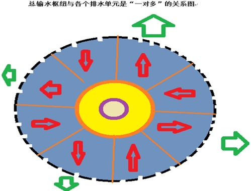 如上圖所示??傮w來說,鋼鐵俠機械手各個排水單元就像是我們看到的地鐵車廂一樣,一節(jié)一節(jié)的,沿圓周而建,按順序排號,連成一體。單個排水單元具備獨立伸縮操作功能,也就是說可以單獨伸展與收縮,與其它單元并不一定同步。因為同步的話,便可能會出現阻水現象。各單元相連,此伏彼起。上圖為一圓形設計,外周密布單向閥。淺藍色部分為涌入水庫的水體,其上設有一個總輸水電腦指揮和監(jiān)督崗哨(電腦控制室),實時操控和監(jiān)督每個排水單元的情況,具有“一對多”信息輻射功能,就像車輪輻射狀那樣。事實上,各個排水單元可以是獨立的個體,也可以連成一體,每個排水單元滿水則排,排完就灌,可以自動調節(jié),只要總排水量與涌入水量配合好就行了。上圖的排水方向與入水方向只是其中的一種情況,并不一定都像上面這種情況。另外,這種自己具有伸縮功能的單向閥水庫可以建成各種形狀,最好都是首尾相連。供專家參考。