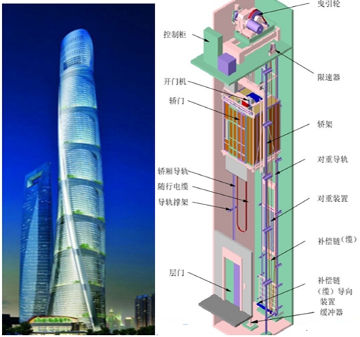 電梯的構造,其實很簡單,就是鏈條式或皮帶式輪滑組在電動機的帶動下飛速運動。今天時代的電梯,已經達到非??斓乃俣?。據說,目前世界第一高樓迪拜哈利法大廈有56部電梯,速度最高達每秒17.4米。下面是我國第一高樓上海中心大廈。