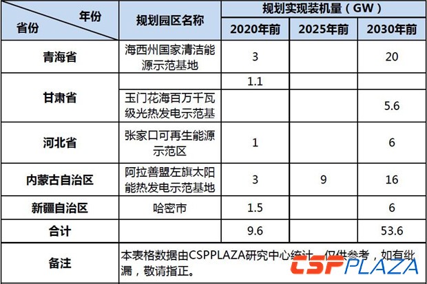 截止目前,據(jù)CSPPLAZA統(tǒng)計,青海省、甘肅省、河北省、內(nèi)蒙古自治區(qū)和新疆自治區(qū)等相關(guān)省份和地區(qū)所規(guī)劃的光熱發(fā)電裝機容量到2020年合計為9.6GW,到2030年合計為53.6GW。