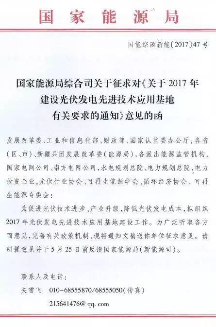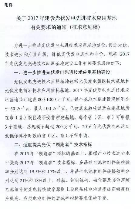 近日,華夏能源網(wǎng)(微信號sinoergy_com)獲悉,國家能源局綜合司發(fā)出了名為《關(guān)于2017年建設(shè)光伏發(fā)電先進(jìn)技術(shù)應(yīng)用基地有關(guān)要求的通知》的征求意見稿,對光伏發(fā)電先進(jìn)技術(shù)應(yīng)用基地建設(shè)的規(guī)劃、優(yōu)選、評分規(guī)則等做意見征集。
