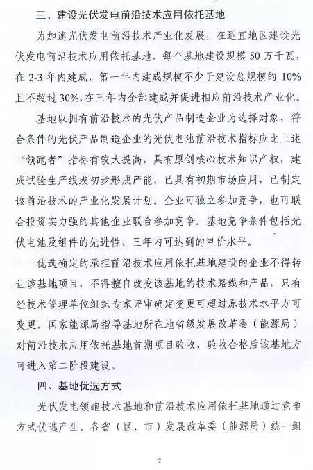相比此前業(yè)界盛傳的“領(lǐng)跑者升級版”計(jì)劃,通知提出的“光伏發(fā)電前沿技術(shù)應(yīng)用依托基地”明顯縮水,每個基地建設(shè)規(guī)模確定為500M瓦(此前傳說每個基地至少1GW),基地在2-3年內(nèi)建成,第一年內(nèi)建成規(guī)模不少于建設(shè)總規(guī)模的10%且不超過30%,在三年內(nèi)全部建成并促進(jìn)相應(yīng)前沿技術(shù)產(chǎn)業(yè)化。