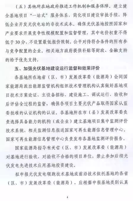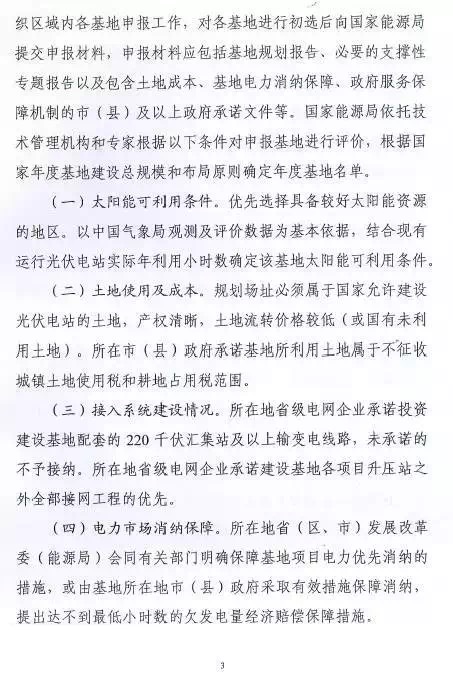 每個省(區(qū)、縣)可申報3個基地,總規(guī)模不超過2G瓦。2016年光伏發(fā)電未達(dá)到最低保障小時數(shù)的省(區(qū)、縣)不得申請。已建成未驗(yàn)收以及在建基地所在市(縣)級區(qū)域不安排新建基地。