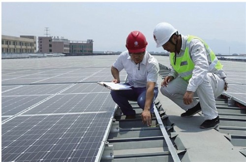 5月31日,蘭溪市經(jīng)濟(jì)開(kāi)發(fā)區(qū)浙江隆鑫紡織有限公司屋頂上,國(guó)網(wǎng)蘭溪市供電公司光伏驗(yàn)收組正在分布式光伏發(fā)電項(xiàng)目進(jìn)行驗(yàn)收,為最后的并網(wǎng)做準(zhǔn)備。這是蘭溪首個(gè)全額上網(wǎng)的屋頂光伏電站,投產(chǎn)后預(yù)計(jì)年均發(fā)電量為321.494萬(wàn)千瓦時(shí)。