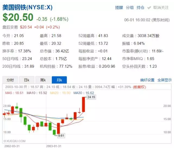 上一次“201條款”被執(zhí)行是在2002年,那一年,為了保護(hù)美國的鋼鐵行業(yè),小布什決定對進(jìn)口鋼鐵產(chǎn)品征收8–30%的關(guān)稅。在關(guān)稅被執(zhí)行的21個月里,冷軋鋼板的價格上漲了16%,同期美國鋼鐵公司(代碼:X)的股價收獲了最高286%的漲幅。然而,下游使用鋼材的制造商們的利潤受到擠壓,最終不得不裁員來減少支出,所以“201條款”的本質(zhì)可以說是殺敵一千自損八百的大殺器。