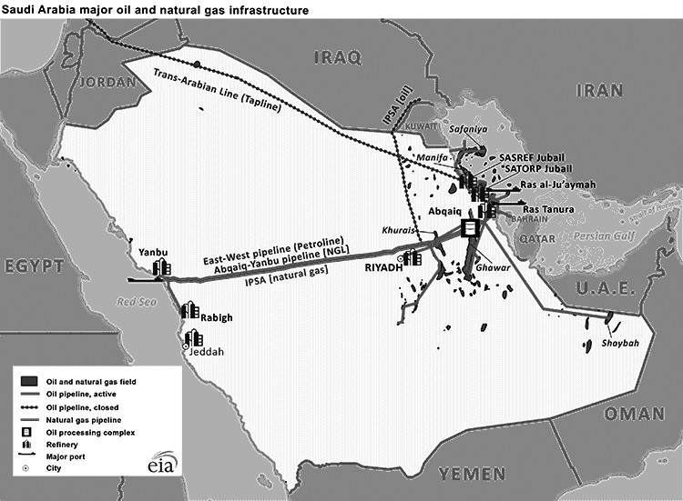 除此之外,沙特阿拉伯國內(nèi)通過輸油管道連接油田與港口,并貫通東西。沙特阿拉伯目前擁有兩條主要的輸油管道項目,一條是連接波斯灣到紅海的East-West管道項目,又稱Petroline,此管道全長746英里,用以連接Abqaiq原油處理廠與紅海出口港。Petroline擁有兩條輸油管道,其中一條56英尺直徑的管道擁有約300萬桶/天的輸油能力,主要用于輸送原油,另一條48英尺直徑的管道擁有約180萬桶/天的輸油能力,曾經(jīng)主要用于輸送液化天然氣,但在近期已被政府用于輸送原油。此管道項目使得沙特阿拉伯原油有機會從紅海出口,擺脫對霍爾木茲海峽的依賴。另一條管道項目主要是連接Abqaiq與Yanbu的液化天然氣管道項目,主要用于輸送液化天然氣,輸油能力約為29萬桶/天。此外,沙特阿拉伯還擁有連接?xùn)|部省份Dhahran與首都Riyadh的輸油管道以及連接Riyadh與北部省份Qassim的輸油管道。