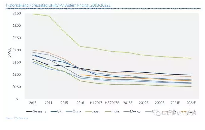 GTM Research預計,到2022年光伏系統(tǒng)價格會比目前下降27%,平均每年下降4.4%。