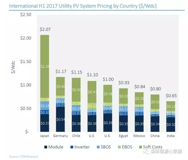 根據(jù)GTMResearch提供的數(shù)據(jù),2017年大型地面光伏系統(tǒng)價格日本最高,達到2.07美元/瓦(DC),而印度最低,僅為0.65美元/瓦;而中國的成本為0.80美元/瓦。
