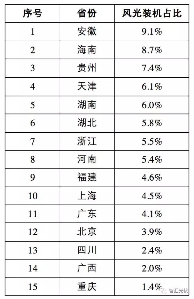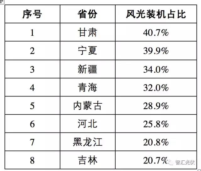 截至2016年底,全國(guó)各省風(fēng)電、光伏累計(jì)裝機(jī)占比達(dá)到20%以上的省份如下表。