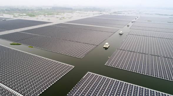 6月22日安徽省淮南市潘集區(qū)采煤塌陷區(qū)水域漂浮式光伏發(fā)電站?;茨鲜信思瘏^(qū)采煤塌陷區(qū)水域上,總裝機容量為40兆瓦的水上漂浮式光伏發(fā)電站開始陸續(xù)并網(wǎng)發(fā)電。