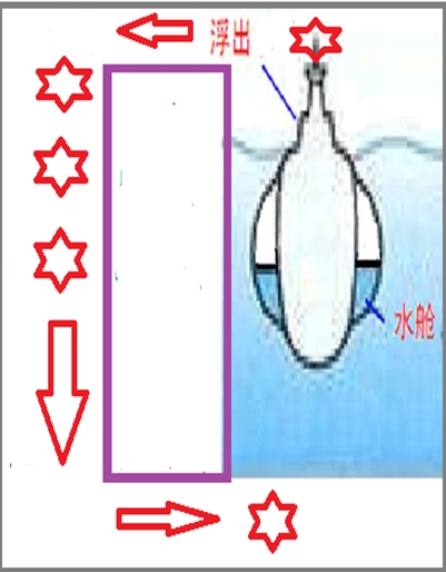 右側(cè)潛水艇樣裝置內(nèi)有儲氣艙,裝有液態(tài)空氣,上浮時(shí)擠出水艙內(nèi)的水,再下沉?xí)r將液態(tài)空氣收回儲氣艙,水艙重新注滿水。