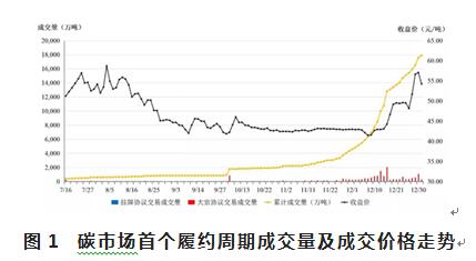 圖1 碳市場首個(gè)履約周期成交量及成交價(jià)格走勢