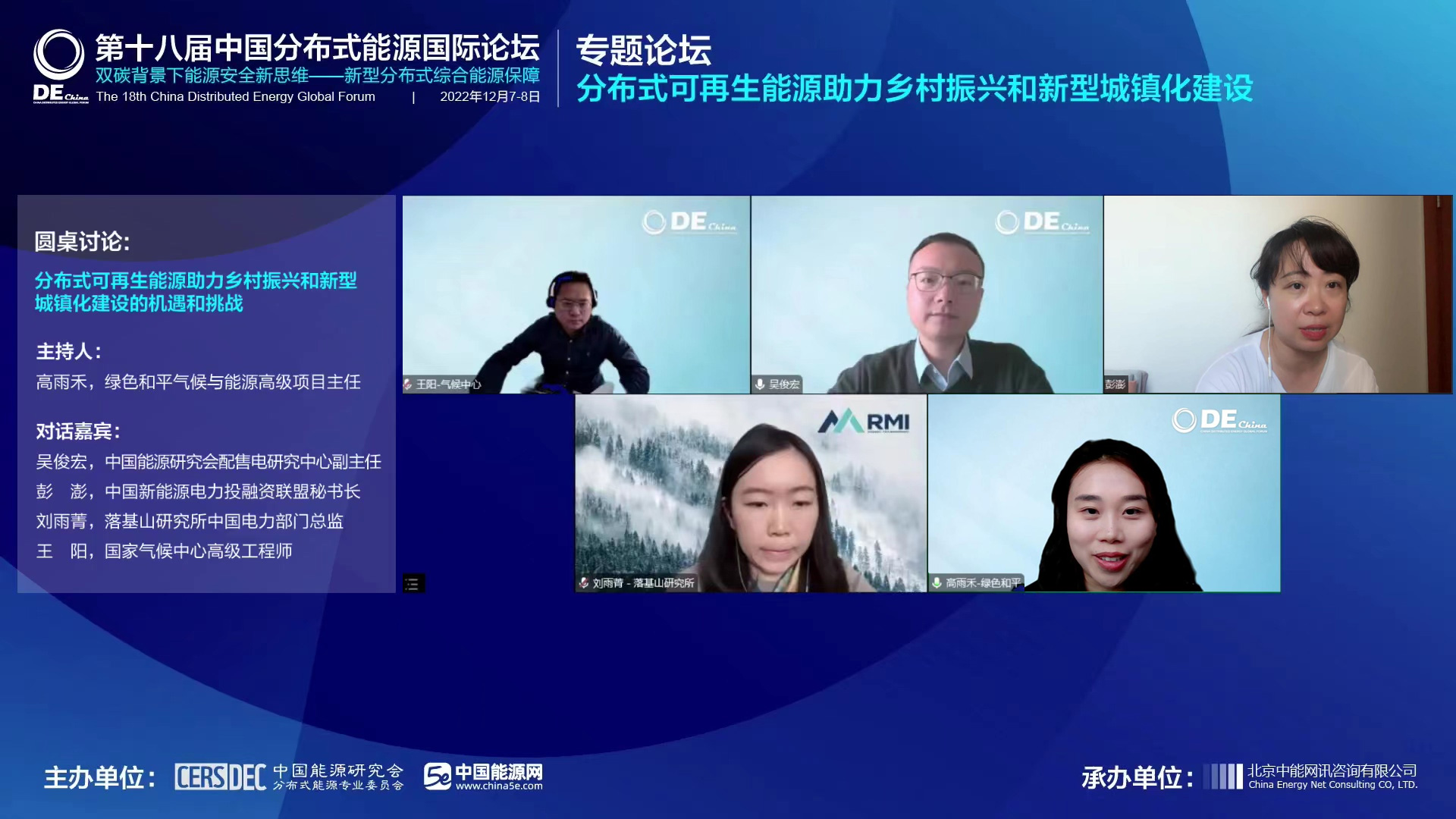 主持人 高雨禾:各位線上的行業(yè)同仁大家上午好!歡迎來到今天的圓桌討論環(huán)節(jié),我是本次環(huán)節(jié)的主持人高雨禾,來自綠色和平氣候與能源項(xiàng)目組。我們今天討論的話題是分布式可再生能源在助力鄉(xiāng)村振興和新型城鎮(zhèn)化建設(shè)中面臨的機(jī)遇和挑戰(zhàn),我們非常有幸的邀請到4位重量級的嘉賓,也是我們行業(yè)的專家與我們分享他們的真知灼見。分別是來自中國能源研究會配售電中心主任吳俊宏;來自中國新能源電力投融資聯(lián)盟秘書長彭澎;來自落基山研究所中國電力部門總監(jiān)劉雨菁;來自國家氣候中國高級工程師王陽博士;
