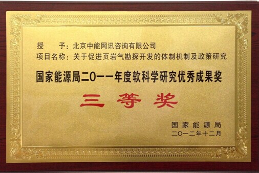 國(guó)家能源局授予:北京中能網(wǎng)訊咨詢有限公司(中國(guó)能源網(wǎng))關(guān)于促進(jìn)頁巖氣勘探開發(fā)的體制機(jī)制及政策研究“國(guó)家能源局2011年度軟科學(xué)研究?jī)?yōu)秀成果獎(jiǎng)”